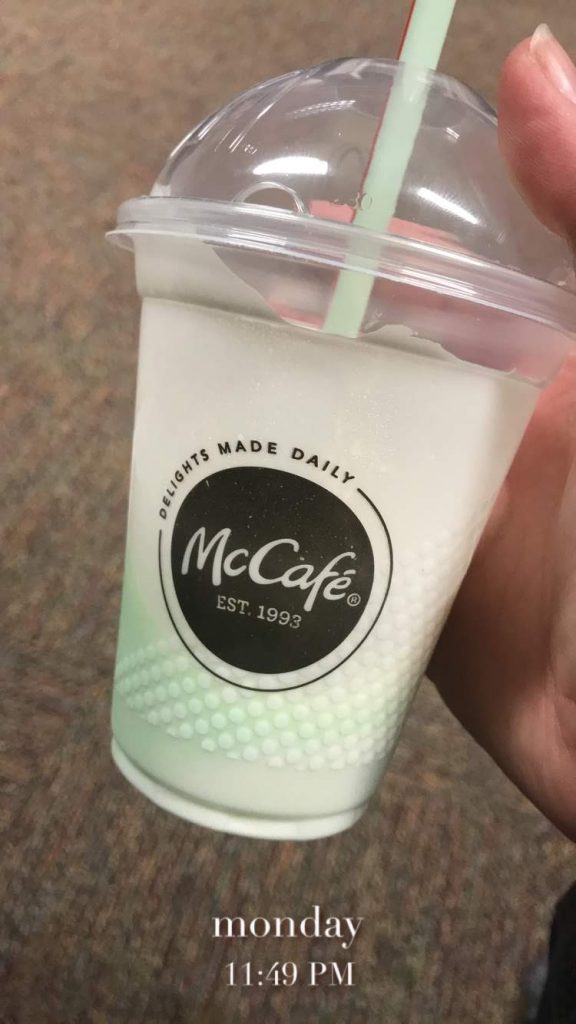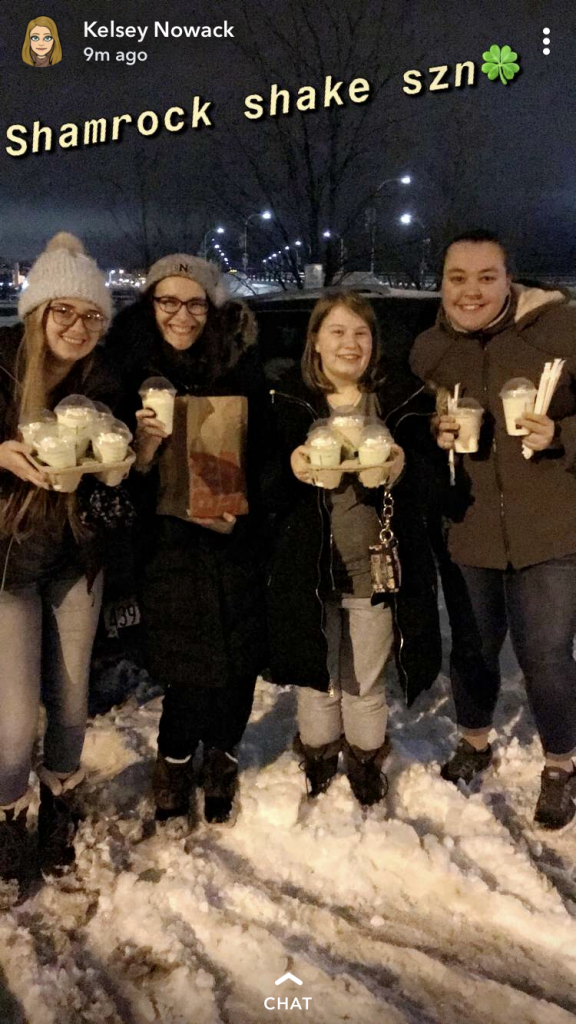 Monday night came with the first adventure of the week before the snowstorm. Once we found out that class was cancelled for Tuesday, we decided to take an adventure to McDonalds to get 13 Shamrock Shakes for the floor.