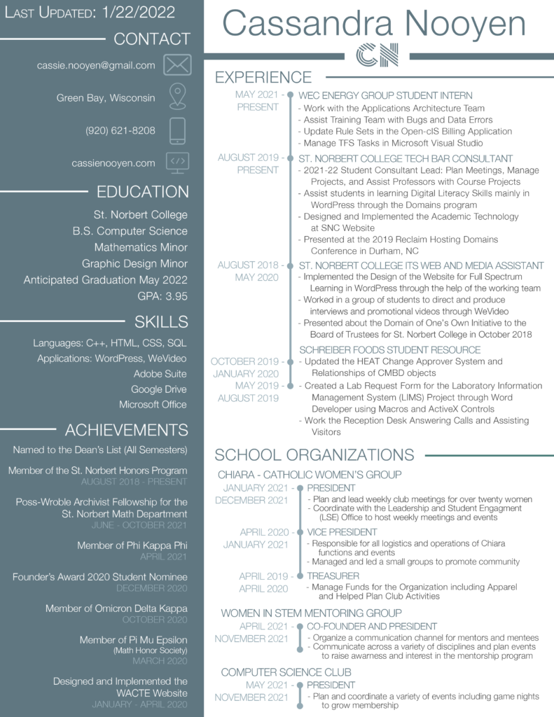 I fell in love with websites after taking my first website design class sophomore year of high school and then competing in Future Business Leaders of America (FBLA). Those experiences helped me to decide to major in Computer Science and combine my love for design and logic. Since starting college, I am constantly reminded that I chose the correct major and after watching the capstone presentations my first year, my eyes were opened to the world of possibilities available with some code and imagination. As I wrap up my time at St. Norbert, I am excited to use my experiences as a springboard to the world of possibility ahead of me.