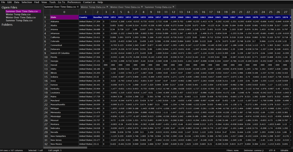 After I finished all the VLookups and got all of the data in the correct orientation, I saved each sheet as a CSV file. I wanted to be able to replace the “N/A” that the VLookups created if data couldn’t be found. I installed a program called “Modern CSV” to be able to do the replace. I don’t love the way Excel works with CSVs, so I was thankful to find a different program. The program allowed me to do a find and replace for the whole cell which was helpful because when searching for 0 to replace, all of the years also wanted to be replaced. After all the replacements, the CSV looked like this: