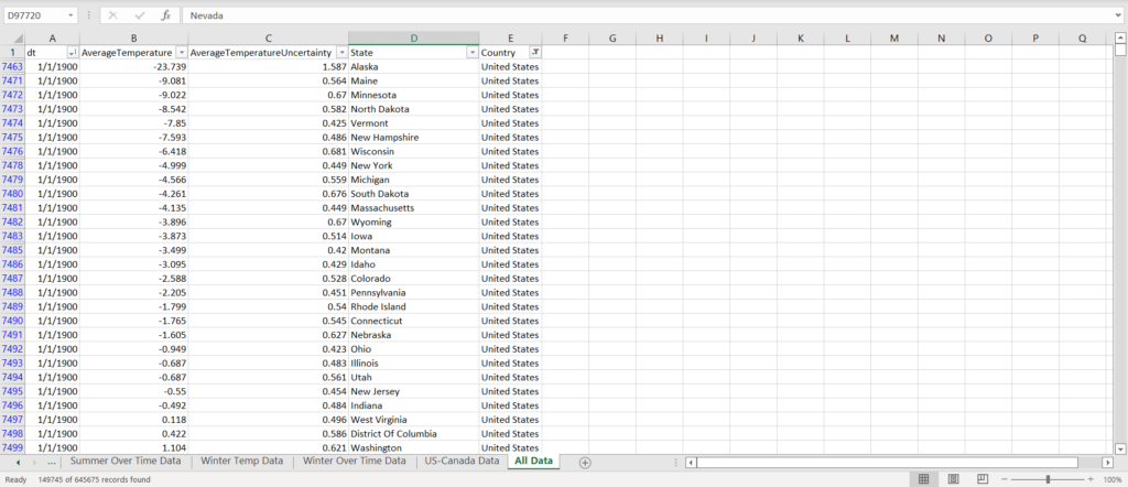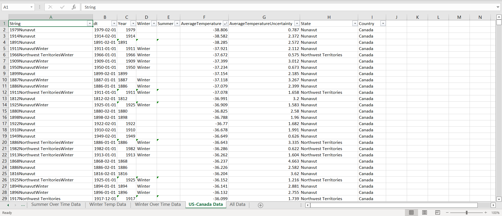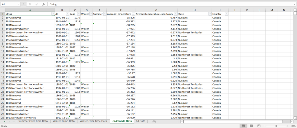 The data set I am using was found on a website called Kaggle. It is titled, “Climate Change: Earth Surface Temperature Data” by Berkeley Earth. It has four main Global Land Temperature Excel files: by city, country, major city, and by state. The one I decided to use for my project is Global Land Temperatures By State. This had the most widespread data for both the United States and Canada where I want to focus my initial efforts.