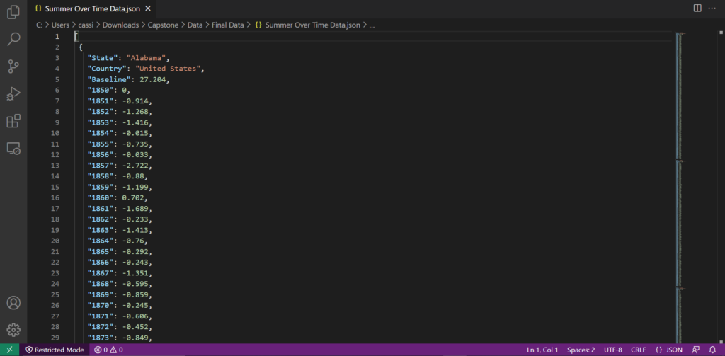 The last step that I did this week was making each CSV into a JSON file for easier reading on the program. However, there are over 150 years of data, so reading in the entire file might make for way too long of a load time. Instead, I want to try to be able to only read in a few years of data at a time and continue to load while also showing the start of the animation. Because of that, I am thinking I orientated my JSON files wrong. Currently, the file is based on location, but I think I may try to flip it so the file is based on year.