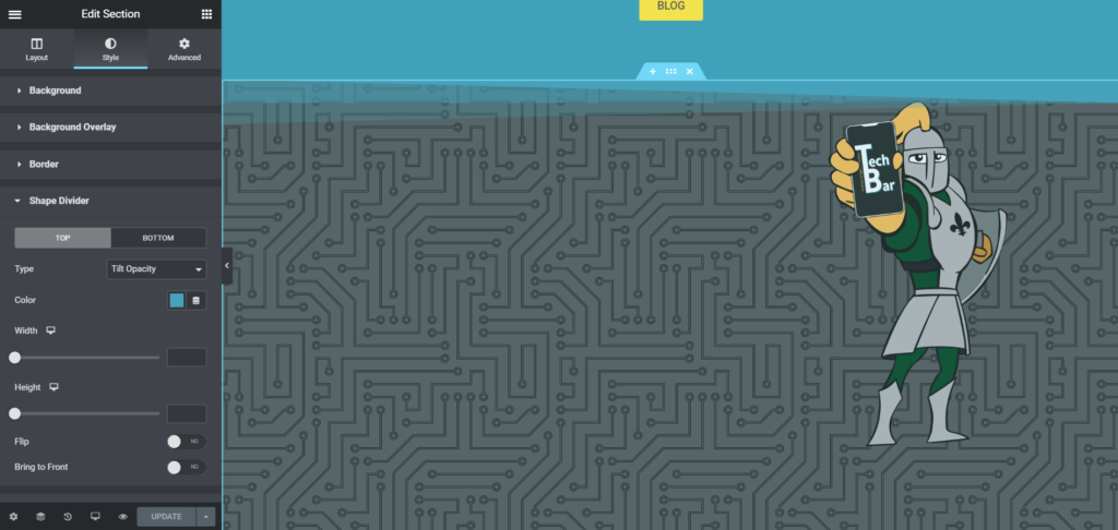 A very simple tool that can add a bit of depth to your page is a shape divider. They can be applied to sections and are found in the style tab (seen below). This allows the section borders on top and bottom to be something different than just a straight line. There are 18 different types to choose from with a variety of customization options for each.