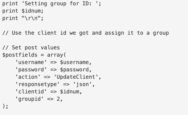 Thankfully, WHMCS had some documentation to get us started. We were able to modify the given example code below to access both Knight Domains and WHMCS information.