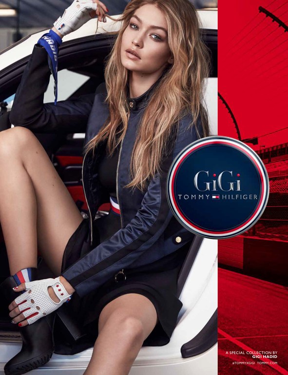 Feminine Touch: In this ad, Gigi has one of her hands in her one hair, and the other resting on her shoe.
