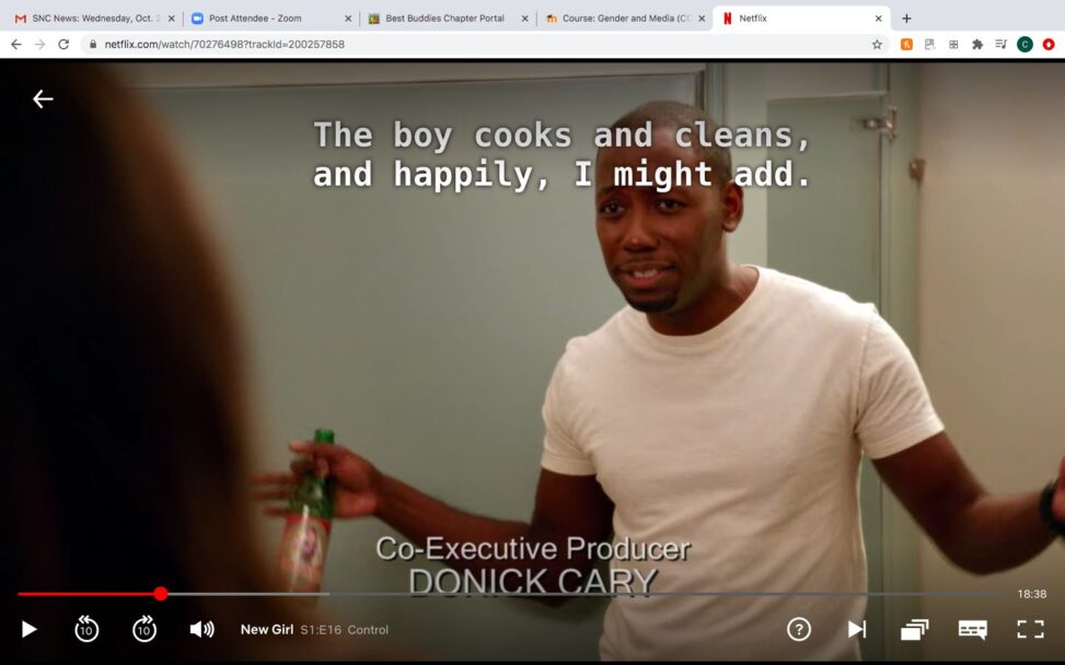 In the beginning of the episode it starts off with Schmidt in a car with CeCe and he starts to explain his feelings where he doesn’t like just being used for sex and that there is more to him. This might not be breaking typical stereotypes but I think now a days this is breaking a stereotype. A lot of time girls are used as objects or only seen as a way to have sex but, in this episode it is the opposite. Schmidt feels used for his body and CeCe is the one calling the shots. Another way of breaking stereotypes is Schmidt starts freaking out because Jesse is adding stuff to the apartment such as lamps and spices that is messing up the way he does things. Nick and Winston say they let Schmidt control the apartment because he does all the cooking and cleaning. Schmidt is showing more feminine traits here of doing the household chores.