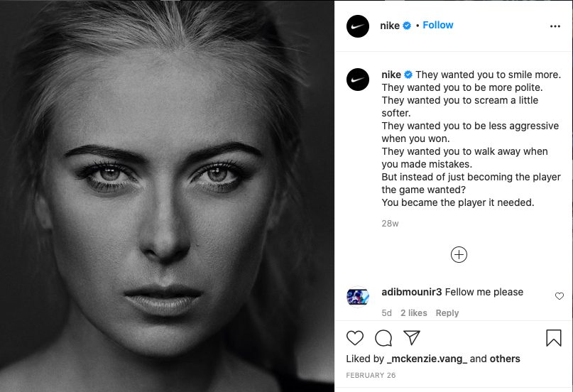 Nike’s feed is a stark contrast compared to Miley Cyrus and Katy Perry. This instagram account features dark colors, mostly black. In addition, the posts, both female and male are serious and powerful. As expected, most of the posts feature athletes. What was interesting however was that their was a wide diversity of people shown. Nike had all races, ethnicity and body types on their page.