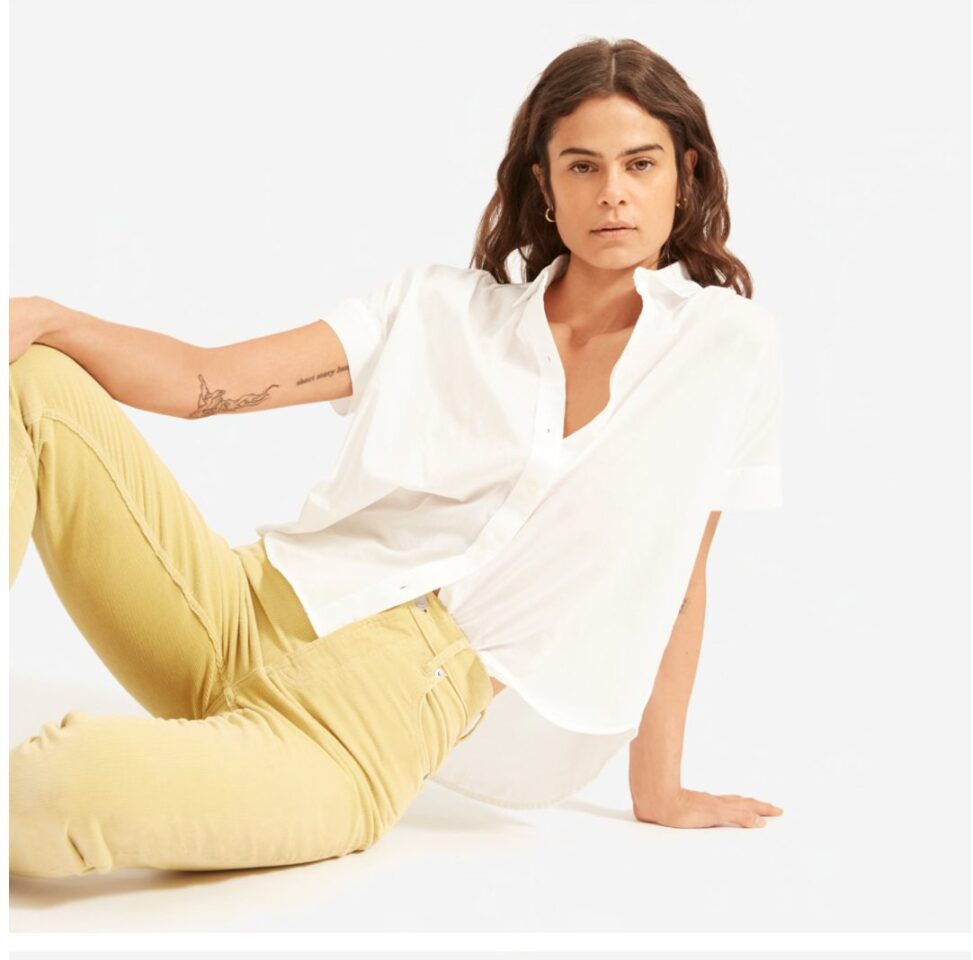 This image represents femininity real well. The model looks a bit shy, feminine, understanding, soft-spoken and warm. Those are a few of the qualities one looks at while looking at the sex role theory. The model is modeling a white shirt but really it could look like she is modeling the pants as well. The pants are standing out compared to the shirt. Gender is relevant here because she is a female and seeing a male in this pose would not be viewed the same as this woman. A man in this position would be seen as relaxed, dominant and comfortable with his masculinity. Compared to the male model, she is revealing a bit more than the male model, he has buttons on his shirt as well but only hers are unbuttoned.