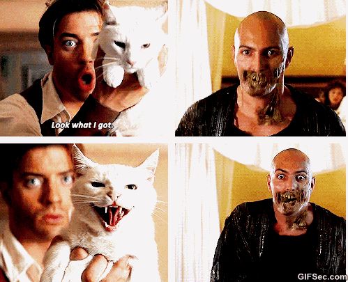 Throughout the first film Imhotep really only shows two emotions: anger or smugness. In this instance however, we see him show another emotion. When he sees a cat Imhotep is visually afraid and we see him literally flee out of that fear.