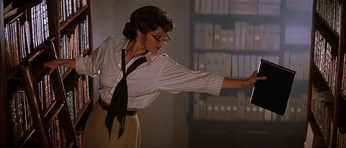 First up, Evelyn Carnahan. She first appears working in a library in Cairo, Egypt. We see her on the top of a ladder putting books back on their shelves. She quickly makes a mess of the library by accidentally knocking all the bookshelves in the room over. After we see her reaction to the chaos, her boss enters the scene and scolds her for the mess. He verbally wonders out loud why he puts up with her. Evelyn responds assertively by reminding him that she can read and write ancient Egyptian, as well as being the only person in the city that knows how to properly organize the library. We see her confident in her abilities as a historian and librarian. Her response is quickly refuted by her boss, but for audience her assertiveness has been established.