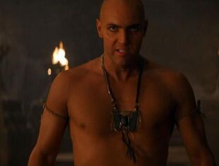 In his first scene, Imhotep supports gender stereotypes by, showing little to no emotions, and being physically larger or higher than the other characters.