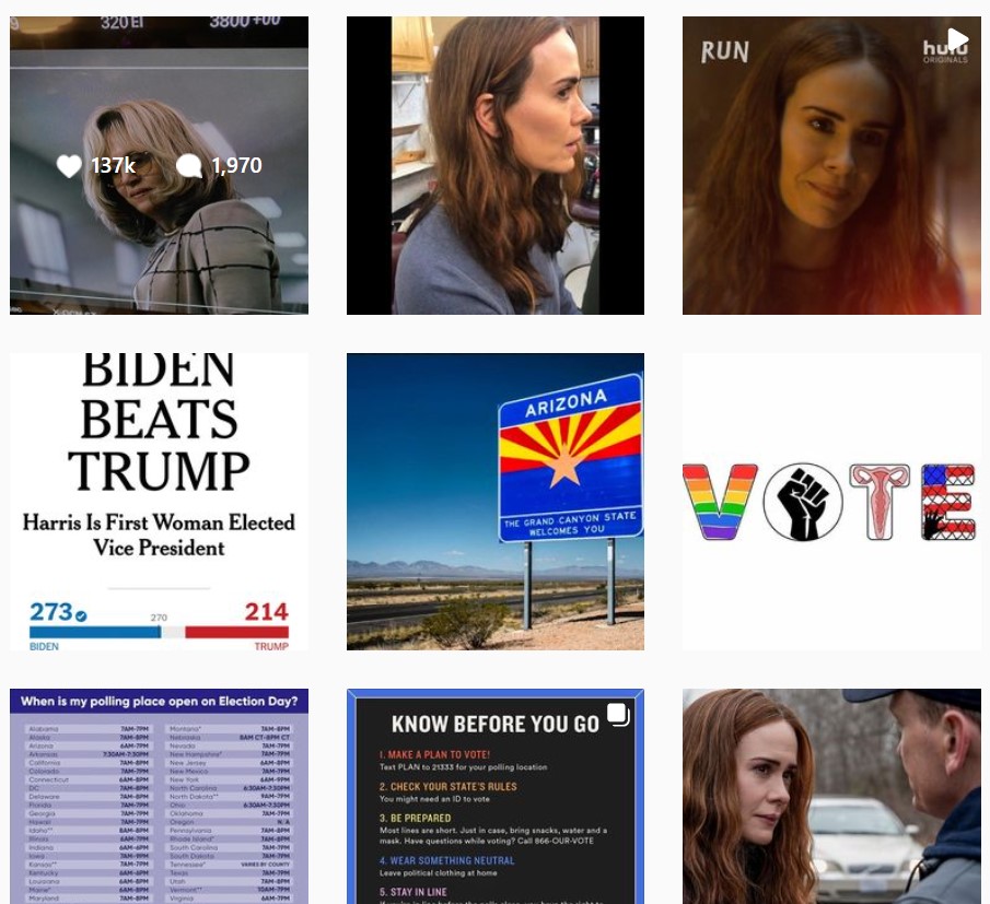 Sarah Paulson shows more masculine traits than feminine by more than just a little. She is loyal which is seen as a feminine trait but that is the only feminine trait that is seen. When looking at masculine traits, it is clear that Paulson is assertive. She defends her own beliefs and is willing to take a stand for them and with others who feel the same, or similarly, as herself. She has a strong personality as well. Upon looking at her Instagram, many of her posts were about political beliefs or other values she holds.