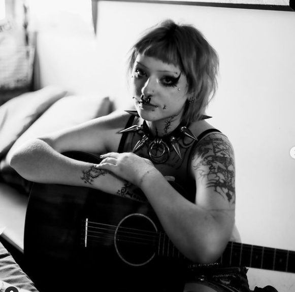 Scrolling through Carolesdaughter’s Instagram account, her physical expression is far from typical and define her and her music in a unique way. Carolesdaughter keeps her hair very short, at times a buzzcut, but sometimes a little longer than that, and is always wearing very dark and heavy black makeup. She decks herself out in lots of hardware jewelry filling her many facial piercings, covering her neck in studs and spikes, and chunky rings. Her bold and cold look is contrasted by the amount of feminine clothing she wears. In many of her pictures, she wears dresses with long knee-high socks or fishnet tights or spaghetti-strap tank tops. Her shoes are very noticeable too, she wears tall chunky and strappy boots with heals. Overall, her look has remained a unique expression of femininity that is contrasted by harder, colder looks that in the past have typically been associated more with men-especially within the rock industry.