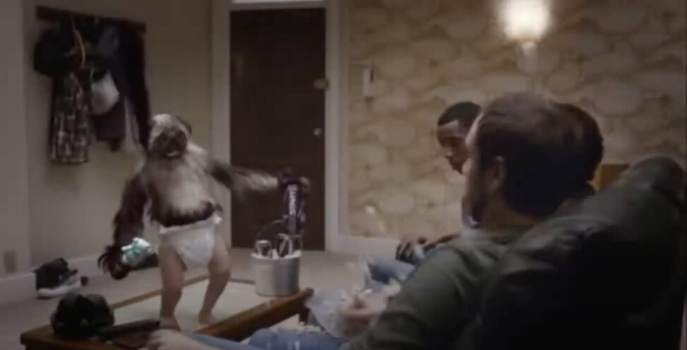 Puppymonkeybaby sounds like what it is. It’s a pug head with a monkey torso and baby legs in a diaper. The commercial starts with three young men in their apartment sitting with nothing much to do. One of the men says he might just chill for the night when suddenly, the wall flips and opens and the puppymonkeybaby enters with a bucket of Mountain Dew kickstart (energy drinks). It starts dancing and liking the guy’s face and singing its name(puppymonkeybaby) as the three guys follow and dance out of the room with the monkey thing. This commercial is funny and creative, but it is absolutely aimed for the male audiences. It’s an all-male cast in a masculine environment of a room with little color and minimal furniture. It was so short it was hard to get any other gender indicators other than the actors that were present. Super funny commercial but would have to say it is for the male audiences.