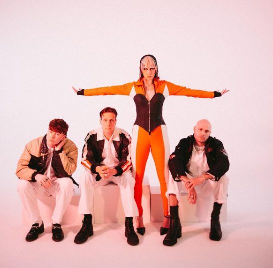 Starting with the Band’s Instagram; their profile photo is the one included in this post, showing the four band members in a row, all the men are sitting in matching white suits looking at the camera. Theresa is the only one standing and wearing different attire. Her arms are stretched out into a “T” like position, and she is staring straight into the camera. She is wearing an orange and white colored jumpsuit, and has layered a black corset-like piece over it and has paired it with black stiletto’s. This image seems to match the mixed feminine/masculine traits in the lyrics of “Seize the Power”. The jumpsuit traditionally feels more masculine and the colors orange and white don’t have a super specific gender identity associated with them. The corset and stiletto’s obviously are very feminine articles, but she has taken a different approach by wearing the corset over the jumpsuit therefore covering more skin. Seeing Theresa’s visual expression in this photo makes me think of another lyric from the song: “Give me a rule, I’ll break it.” It could be interpreted that this image of wearing the corset and heels in a less traditional way is Theresa’s way of breaking down the stereotypical representation of women in the music industry. Her identity is more complex than the typical female lead singer. One thing is certain, I think the placement and pose of Theresa standing above the other male members speaks to her role in the rock band. She may be the only female in her group, but she certainly has seized the power of the band.